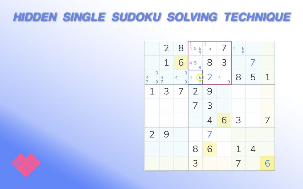 The cell itself has more than one candidate option left, so the correct number is hidden amongst the rest of the number. That’s where the name “Hidden Single” comes from!